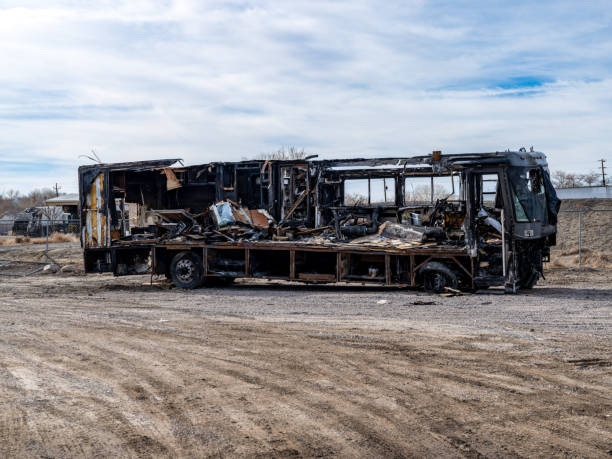 Burned up Motor home parked in a dirt field.