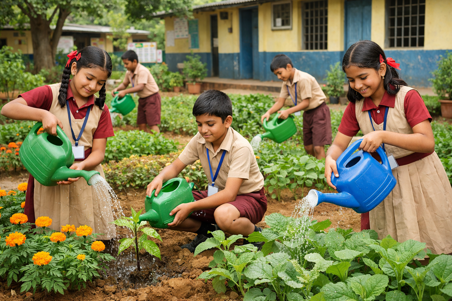 ಗುರುದೇವ ರವೀಂದ್ರನಾಥ ಟಾಗೋರ್ ರವರ ಶಿಕ್ಷಣದ ಪರಿಕಲ್ಪನೆಯಲ್ಲಿ ಕ್ರಿಯಾಶೀಲ ಚಟುವಟಿಕೆಗಳಿಗೆ ಮೊದಲ ಆದ್ಯತೆ. ಮಕ್ಕಳ ಪಾಲಿಗೆ” ಜೀವಂತ ಪ್ರಯೋಗಾಲಯಗಳು ” ಎನಿಸಿರುವ ಶಾಲಾ ಕೈತೋಟಗಳು ಅವರಲ್ಲಿ ಪರಿಸರ ಪ್ರೇಮ ಬೆಳೆಸುವ ಮೂಲ ತಾಣಗಳು. ಅಲ್ಲಿ ಗಿಡ ನೆಡುವ, ಗಿಡಗಳಿಗೆ ನೀರುಣಿಸುವ, ಕಳೆ ಗಿಡಗಳನ್ನು ಕೀಳುವುದೇ ಮೊದಲಾದ ಚಿಕ್ಕ-ಪುಟ್ಟ ಕೆಲಸಗಳನ್ನು ಮಾಡಿಸುವುದು ಖಂಡಿತ ಅಪರಾಧವಲ್ಲ. ಸಸಿಗಳ ಬಗ್ಗೆ ಅರಿವು ಪಡೆದುಕೊಳ್ಳಲು ಇದು ಸಹಕಾರಿ. ಇದರಿಂದ ಮಕ್ಕಳು ಚಿಕ್ಕ ಪುಟ್ಟ ಜವಾಬ್ದಾರಿ ಗಳನ್ನು ನಿಭಾಯಿಸುವುದನ್ನೂ ಕಲಿಯುತ್ತಾರೆ. ಇದು ಪರಿಸರ ವಿಜ್ಞಾನದ ಕಲಿಕೆಯೇ ಅಲ್ಲವೇ? ಅಲ್ಲದೆ ನೀರಿನ ಬಕೆಟ್ ಹಿಡಿದ ಮಾತ್ರಕ್ಕೆ ಮಕ್ಕಳ ಕೈ ಪೆನ್ನು ಹಿಡಿಯಲು ಆಗದಷ್ಟು ಒರಟಾ ಗುವುದೂ ಇಲ್ಲ ( ಸತತವಾಗಿ ಕೆಲಸ ಮಾಡಿಸುವುದಿಲ್ಲ ತಾನೇ)