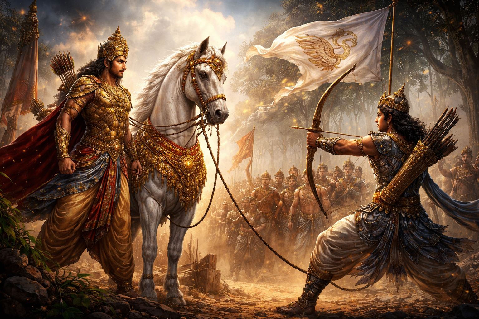 ಹಾಗೆ ನಾನು ಈಕ್ಷಿಸುತ್ತಿದ್ದಾಗಲೇ ಡಂಗುರದ ದನಿ ಕೇಳಿಬಂತು. ನಮ್ಮ ಕುದುರೆಯನ್ನು ಕಟ್ಟಿಹಾಕುವ ನಿರ್ಧಾರ ಮಾಡಿದ್ದ ಹಂಸಧ್ವಜ. ಅವನು ನಮ್ಮ ಜೊತೆಗಿನ ಯುದ್ಧಕ್ಕೆ ಮನಸ್ಸು ಮಾಡಿದ್ದೇಕೆ ಎಂಬ ವಿಷಯವೂ ಸ್ವಲ್ಪ ಸಮಯದಲ್ಲಿಯೇ ನನ್ನ ಸೇವಕರ ಮೂಲಕ ತಿಳಿದುಬಂತು. ನಮ್ಮ ಯಾಗದ ಕುದುರೆ ಅವನ ನಗರಿಯನ್ನು ಪ್ರವೇಶಿಸಿದ ತಕ್ಷಣವೇ ತನ್ನ ಆಪ್ತ ಸಚಿವರ ಸಭೆಯನ್ನು ಕರೆದನಂತೆ. “ಪಾಂಡವರ ಯಾಗದ ಕುದುರೆಯನ್ನು ಕಟ್ಟಿ ಅರ್ಜುನನ ಜೊತೆ ಸಂಘರ್ಷಕ್ಕಿಳಿದರೆ ಸಾಕ್ಷಾತ್ ಶ್ರೀಕೃಷ್ಣ ಪರಮಾತ್ಮನೇ ನಮ್ಮ ಈ ಭೂಮಿಯಲ್ಲಿ ಪ್ರತ್ಯಕ್ಷನಾಗುತ್ತಾನೆ. ಇಷ್ಟರವರೆಗೂ ನಾವು ಯಾರೂ ಕೃಷ್ಣನನ್ನು ಕಂಡವರಲ್ಲ. ಈಗ ಕಾಣುವ ಸುಯೋಗ ಒದಗಿಬಂದಿದೆ. ಕೃಷ್ಣ ಪ್ರತ್ಯಕ್ಷನಾಗಿ ನಮ್ಮನ್ನು ವಿರೋಧಿಸಿದರೂ ಅದು ನಮಗೆ ಸಂತಸವೇ. ಅದಕ್ಕಾಗಿ ಕುದುರೆಯನ್ನು ಕಟ್ಟಿಹಾಕಬೇಕಿದೆ” ಎಂದನಂತೆ. ಅಂದರೆ, ಕೃಷ್ಣದರ್ಶನದ ಹಂಬಲದಿಂದಲೇ ಅವನು ನಮ್ಮ ಯಾಗದ ಕುದುರೆಯ ಚಲನೆಗೆ ತಡೆಯೊಡ್ಡಿದ್ದ. ರಾಜಾಜ್ಞೆ ಹೊರಟ ಮೇಲೆ ಯುದ್ಧ ನಿಶ್ಚಯ ಎನ್ನುವುದು ನನಗೆ ಸ್ಪಷ್ಟವಾಯಿತು.