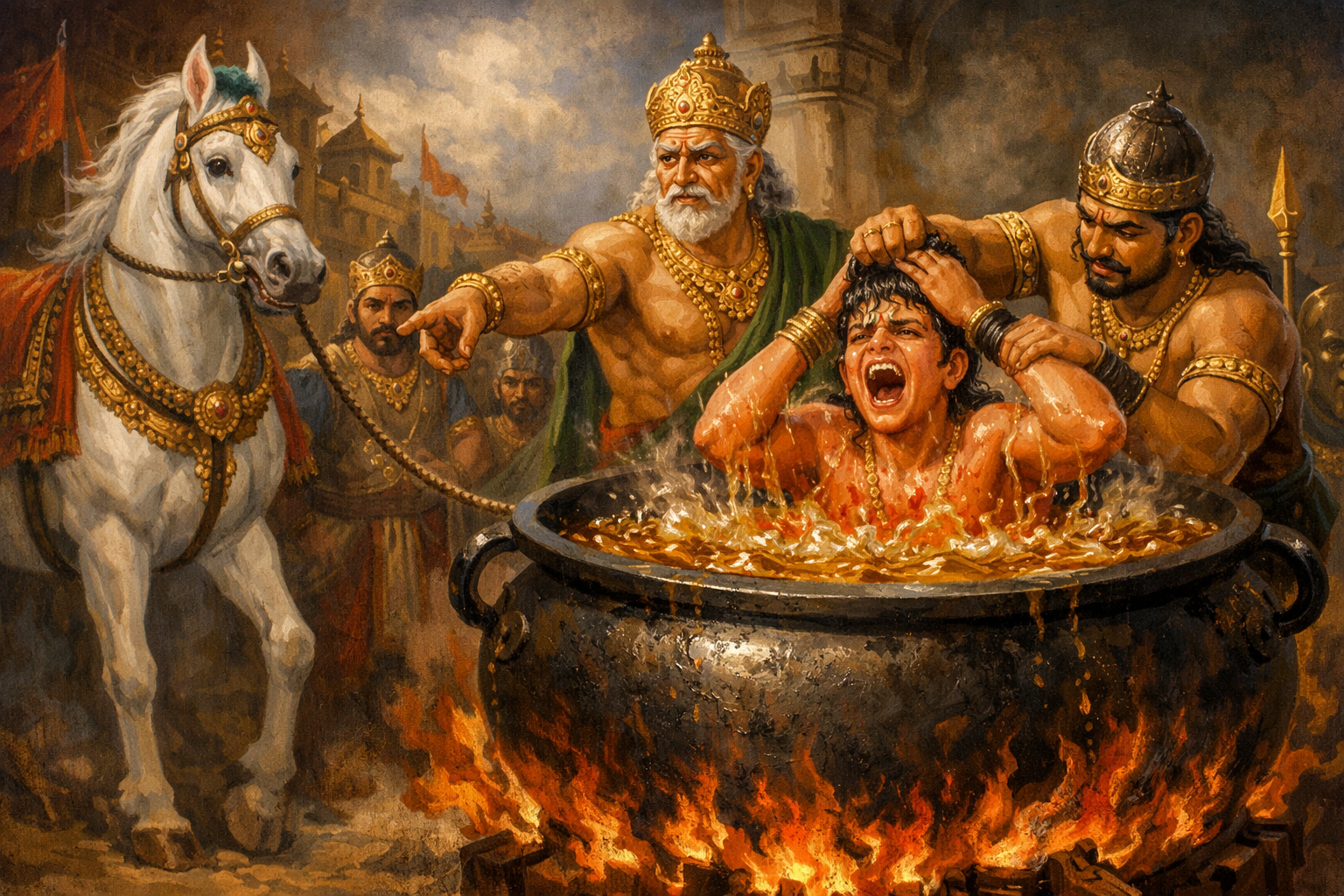 ಅರಸ ತಡಮಾಡಲಿಲ್ಲ. ಆಪ್ತಸಚಿವ ಎನಿಸಿಕೊಂಡ ಸುಮತಿಯನ್ನು ಕರೆದ. “ಸುಧನ್ವನ ಕೈಗಳನ್ನು ಕಟ್ಟಿ ಕುದಿವ ಎಣ್ಣೆಯಲ್ಲಿ ಎಸೆಯಬೇಕು” ಎಂಬ ಆಜ್ಞೆಯನ್ನು ನೀಡಿದ. ಅದನ್ನು ಪೂರೈಸುವ ಹೊಣೆಯನ್ನು ಸುಮತಿಗೆ ನೀಡಿದ. ರಾಜ ಘೋಷಿಸಿದ ಶಿಕ್ಷೆಯನ್ನು ರಾಜಗುವರನಿಗೆ ನೀಡುವುದಕ್ಕಾಗಿ ಸುಧನ್ವನನ್ನು ಸೆಳೆದೊಯ್ದ ಸುಮತಿ.